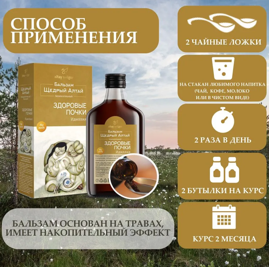 Травяной сбор в бальзаме оказывает мягкое воздействие на организм, способствует снятию воспалений, уменьшению болевых ощущений в почках. При постоянном применении бальзама укрепляется иммунитет, улучшается работа почек.